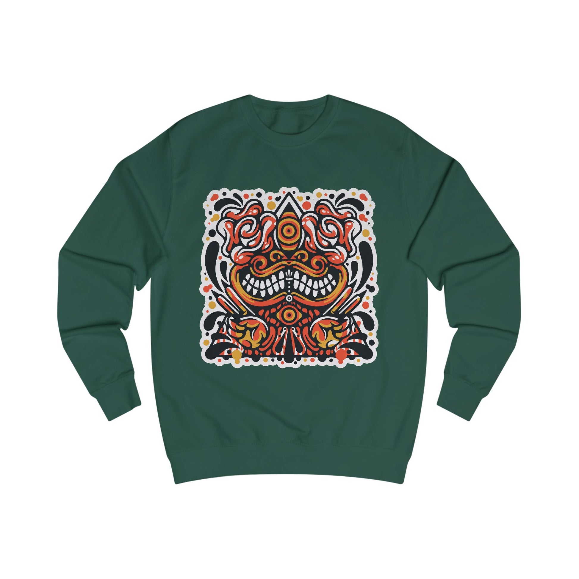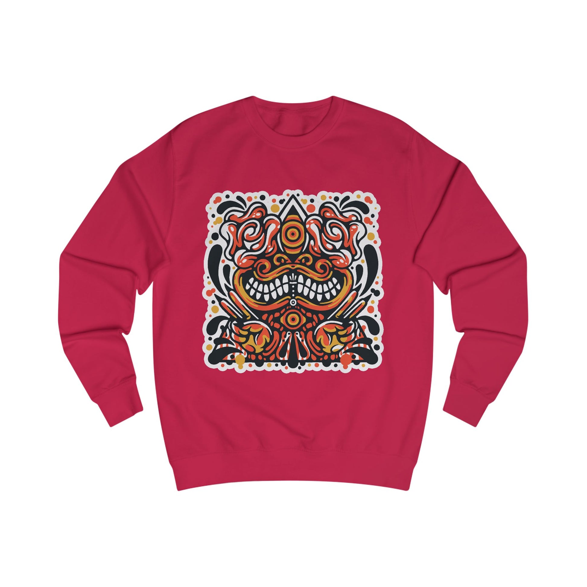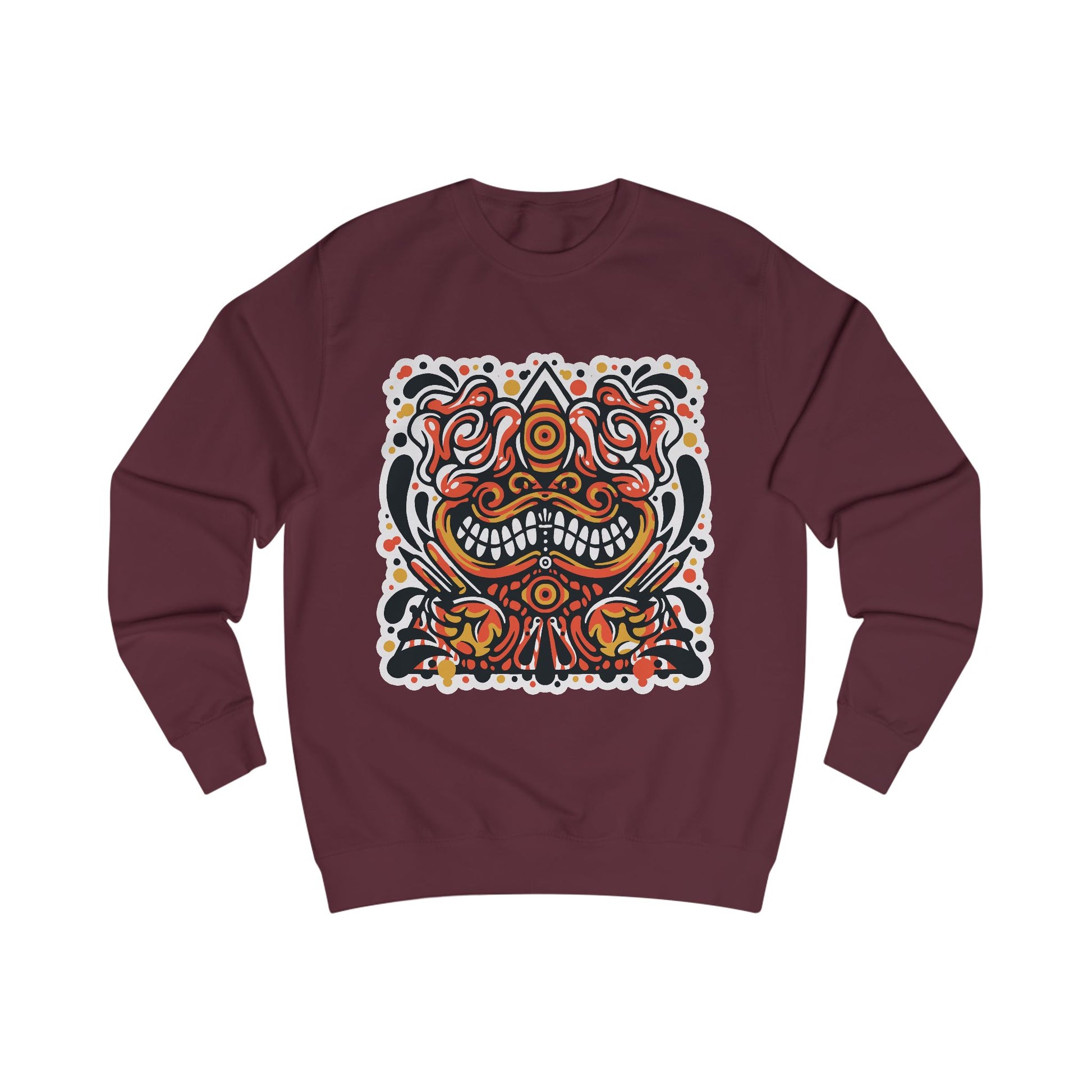 This cotton tee carries a bold, tattoo-inspired graphic that feels equal parts vintage flash sheet and street-art energy. The central motif, a symmetrical, grinning face with swirling floral and ornamental details in warm reds, oranges and deep blacks sits squarely on the chest and reads like a talisman: playful, slightly fierce and full of movement. Wear it to bring a confident, hand-crafted vibe to easygoing days: layered under a denim jacket, paired with worn-in jeans, or folded into your travel pack for festival nights and late drives. The breathable, midweight fabric keeps the print crisp while staying comfortable through repeated wear and washing. This is for people who like expressive, art-forward apparel that tells a small story every time it’s worn.